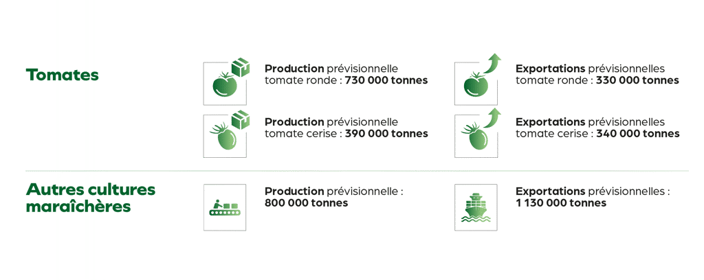 Avec pour figure de proue la tomate, star incontestée de notre agriculture, la filière des cultures maraîchères consacre, cette année, une superficie de 23 820 hectares aux cultures maraîchères et de 7700 hectares pour la tomate, incluant tomate ronde et tomate cerise. Pas moins de 113 unités de valorisation sont dédiées à cette activité. Depuis le début de la campagne, des subventions sont octroyées pour l’acquisition de semences et plants agréés de tomate ronde, à raison d’un plafond de 70 000 Dhs par hectare sous serre et 40 000 Dhs par hectare plein champ.
