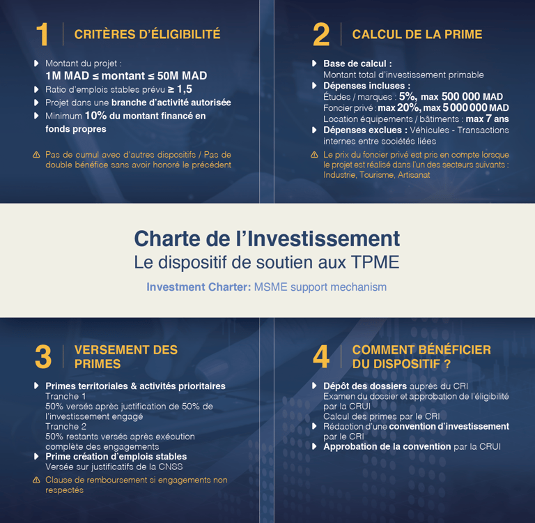 Le dispositif s’adresse aux personnes morales générant entre 1 et 200 millions de dirhams de chiffre d’affaires annuel et désireuses d’investir entre 1 et 50 millions de dirhams. Il couvre aussi bien les entreprises existantes que les nouvelles, sous réserve de respecter un ratio minimum de 1,5 emploi stable créé par million de dirhams investi.
