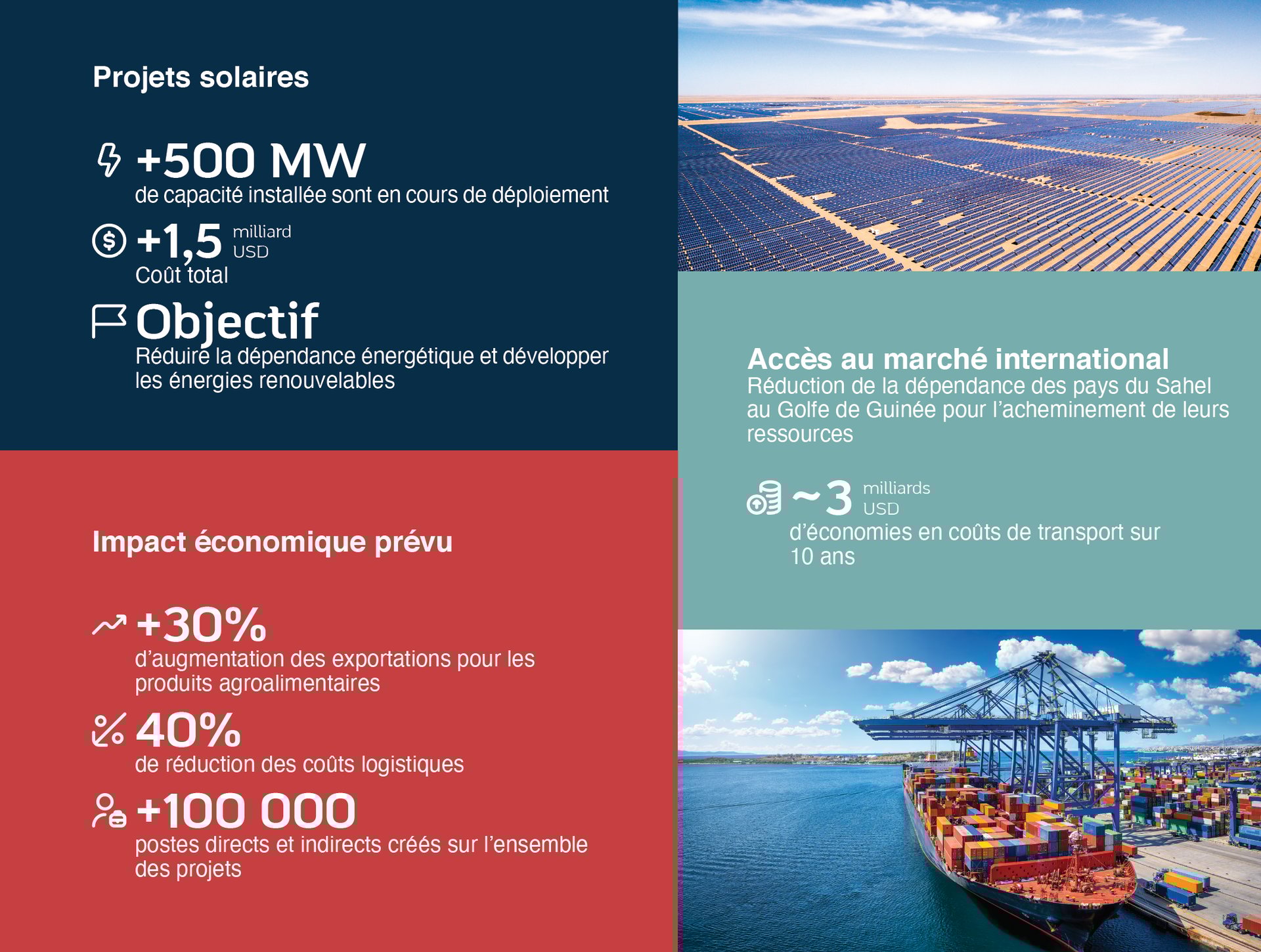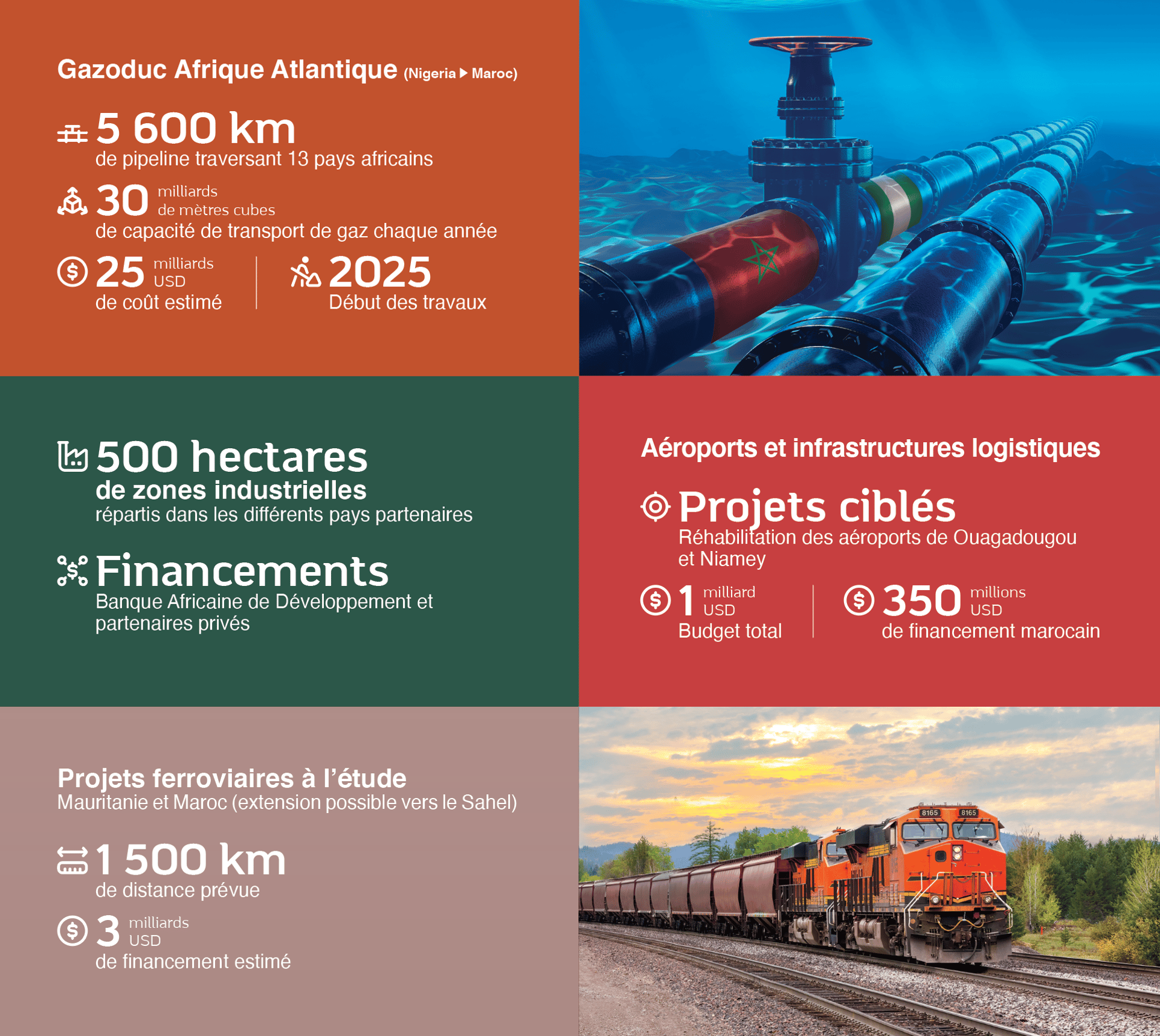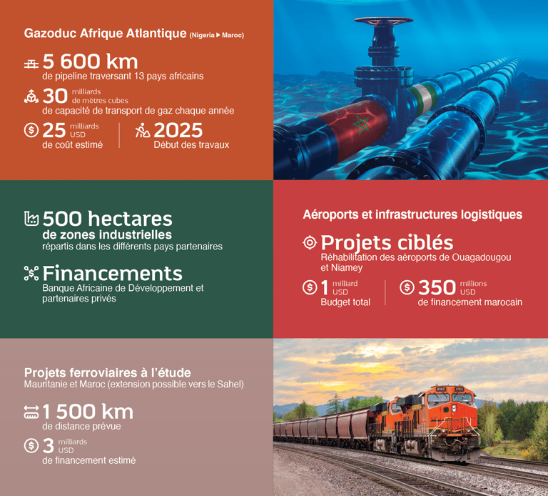 Le Maroc se dote de réseaux terrestres, ferroviaires, aériens et maritimes pour offrir une connectivité complète et ambitieuse qui couvre l’ensemble du territoire national. En plus de répondre aux besoins de croissance du Royaume, cette infrastructure intégrée vise à désenclaver les pays du Sahel. Elle porte le projet de stimuler les échanges économiques, favoriser l’intégration des économies africaines, et transformer le Maroc en un carrefour régional incontournable pour la coopération Sud-Sud.