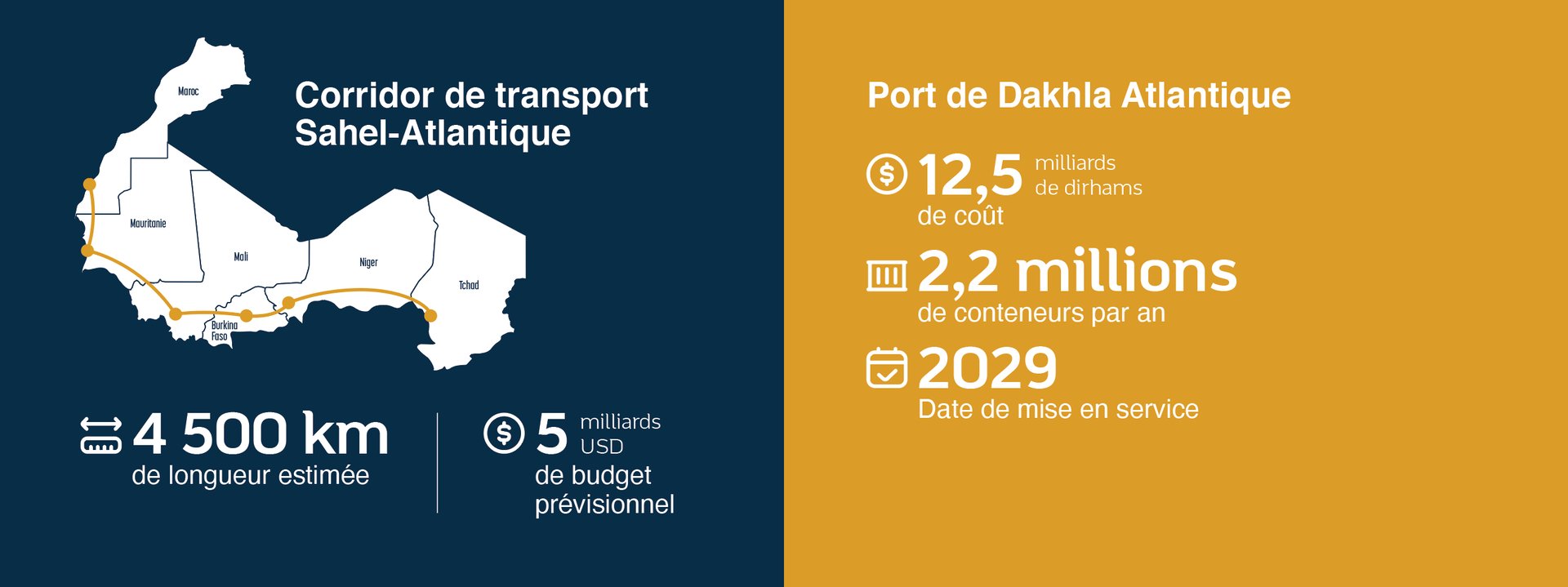 Fondée originellement sur la mise à disposition des infrastructures portuaires, routières et ferroviaires du Maroc au profit des pays enclavés du Sahel, l’initiative a pour objectif ultime d’offrir un corridor de connectivité et de prospérité traversant le Tchad, le Niger, le Burkina Faso, le Mali et la Mauritanie pour arriver au sud du Maroc avec, pour point de chute, la plateforme du Port Atlantique de Dakhla.