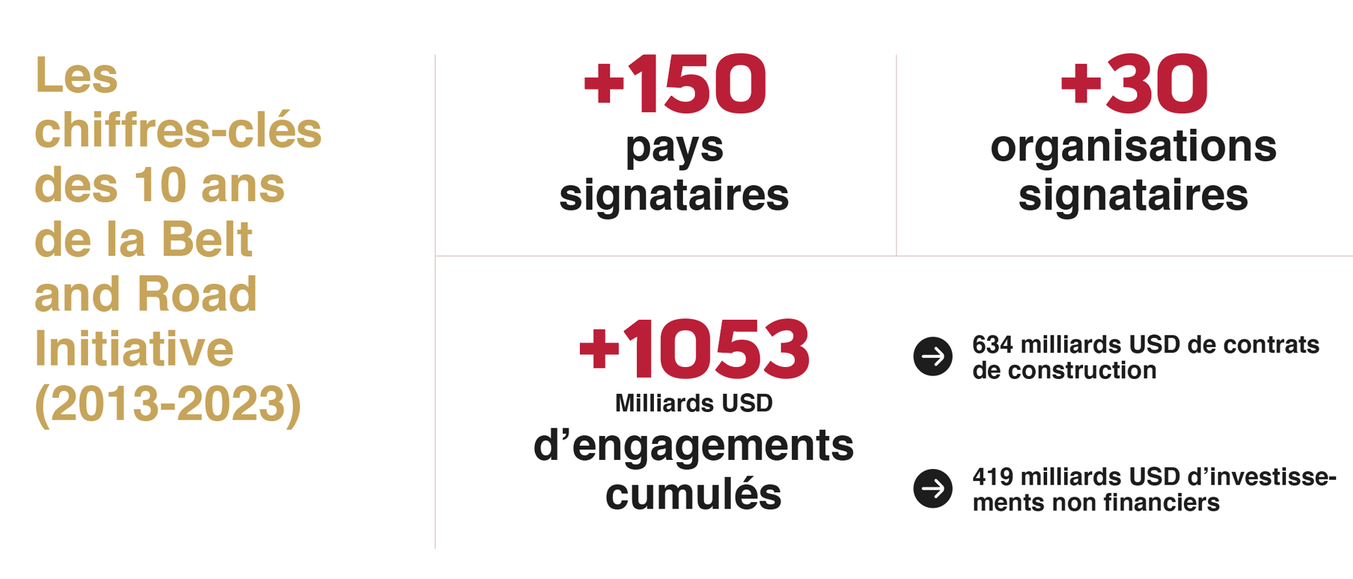Lancée en 2013 par le gouvernement chinois, l’Initiative « Belt and Road » (BRI) s’inspire des anciennes routes commerciales de la soie pour établir un réseau de développement économique et d’infrastructure à travers l’Eurasie. Depuis, la BRI occupe le centre de la politique économique chinoise. Elle concerne plus de 150 pays regroupant 4,8 milliards d’habitants et représentant près de 40% du produit intérieur brut (PIB) de la planète.