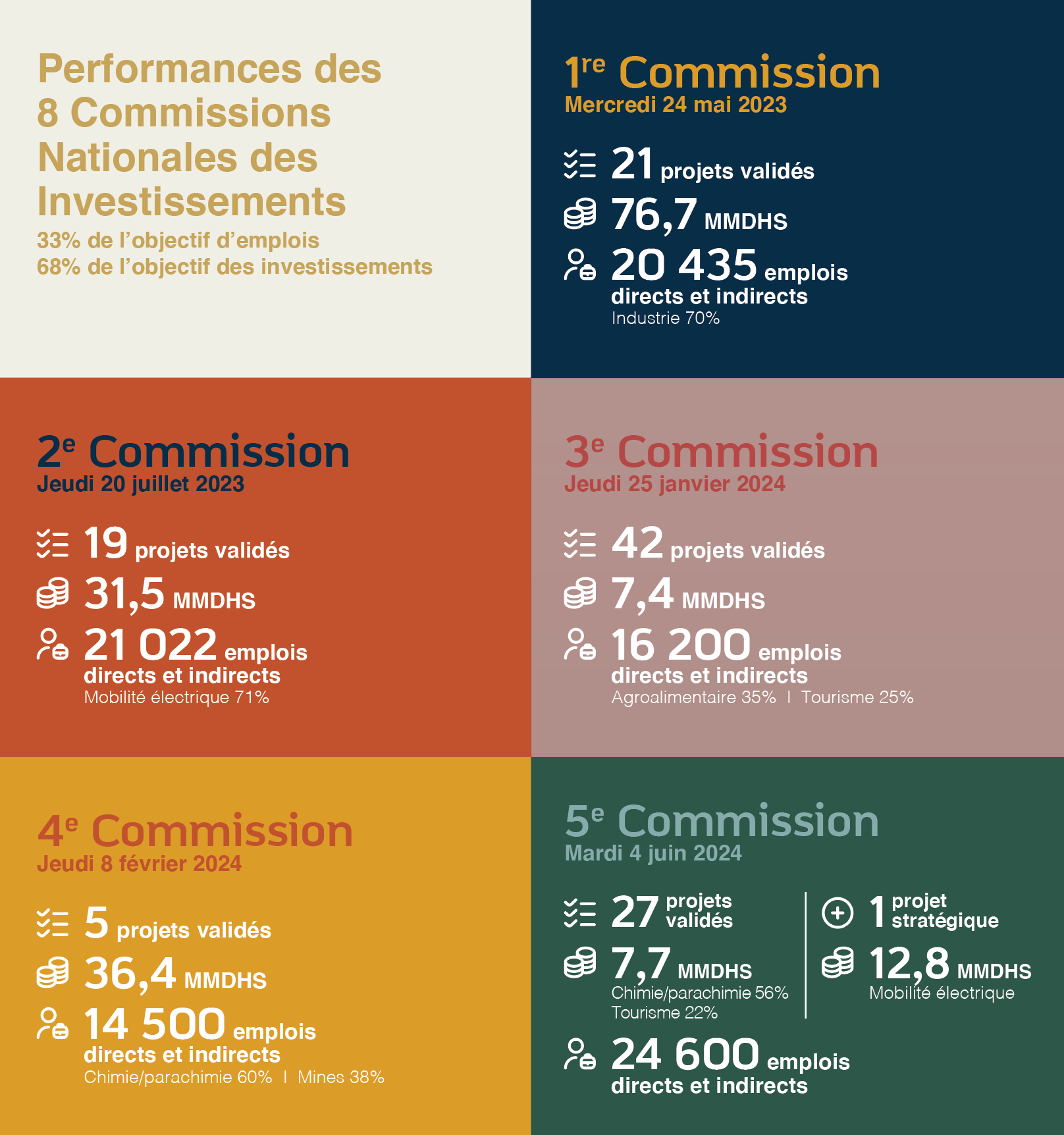 Les performances prometteuses des 8 commissions illustrent ainsi une progression tangible vers l’objectif fixé : inverser la tendance actuelle, encore dominée par l’investissement public, afin d’atteindre une répartition de 2/3 d’investissement privé pour 1/3 d’investissement public.