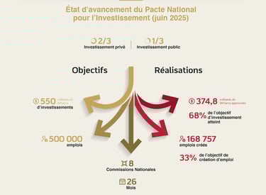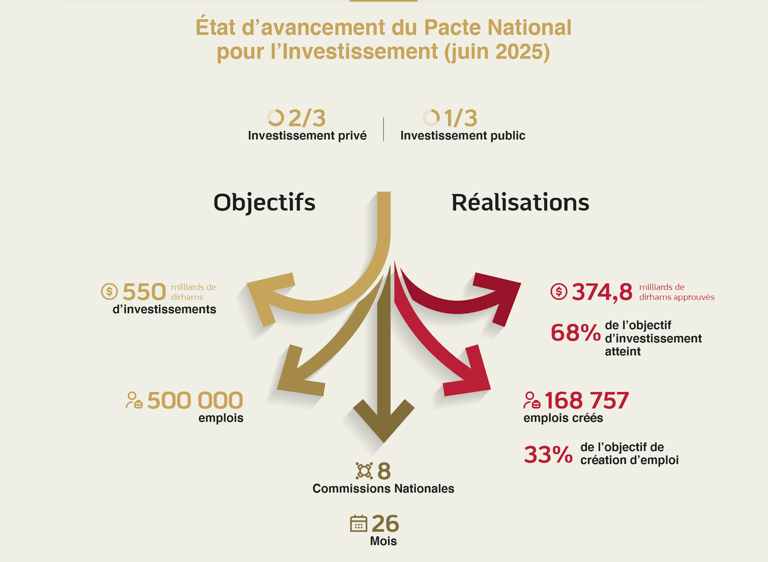 Le rythme soutenu des commissions et les chiffres importants réalisés à ce jour permettent d’envisager avec espoir l’atteinte des objectifs du Pacte National pour l'investissement d’ici 2026. Ainsi, avec 374,8 milliards de dirhams de projets validés sur un total de 550 milliards de dirhams prévus, ce sont déjà près de 68% des objectifs d’investissement atteints. De même, le résultat cumulé des projets approuvés sur l’ensemble des commissions fait apparaître un nombre record de 168 757 emplois créés, représentant plus de 33% des 500.000 emplois projetés à l’horizon 2026.